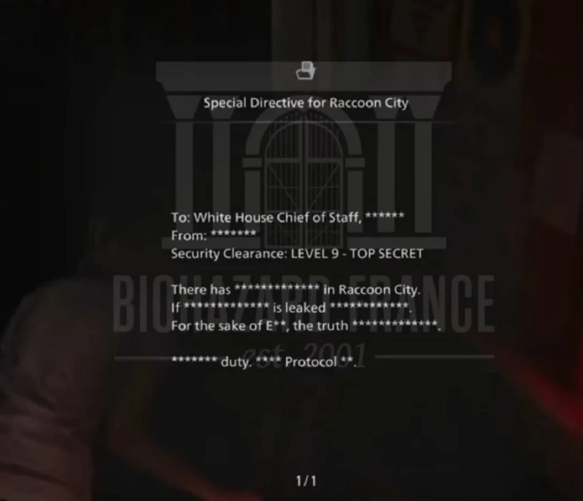 Многие считают, что записка — это такой тизер Леона (в фамилии Кеннеди 7 букв). Она адресована главе аппарата Белого дома и содержит упоминания «Раккун-Сити», «протокола», «долга», «утечки», «правды», а также много отредактированных слов.