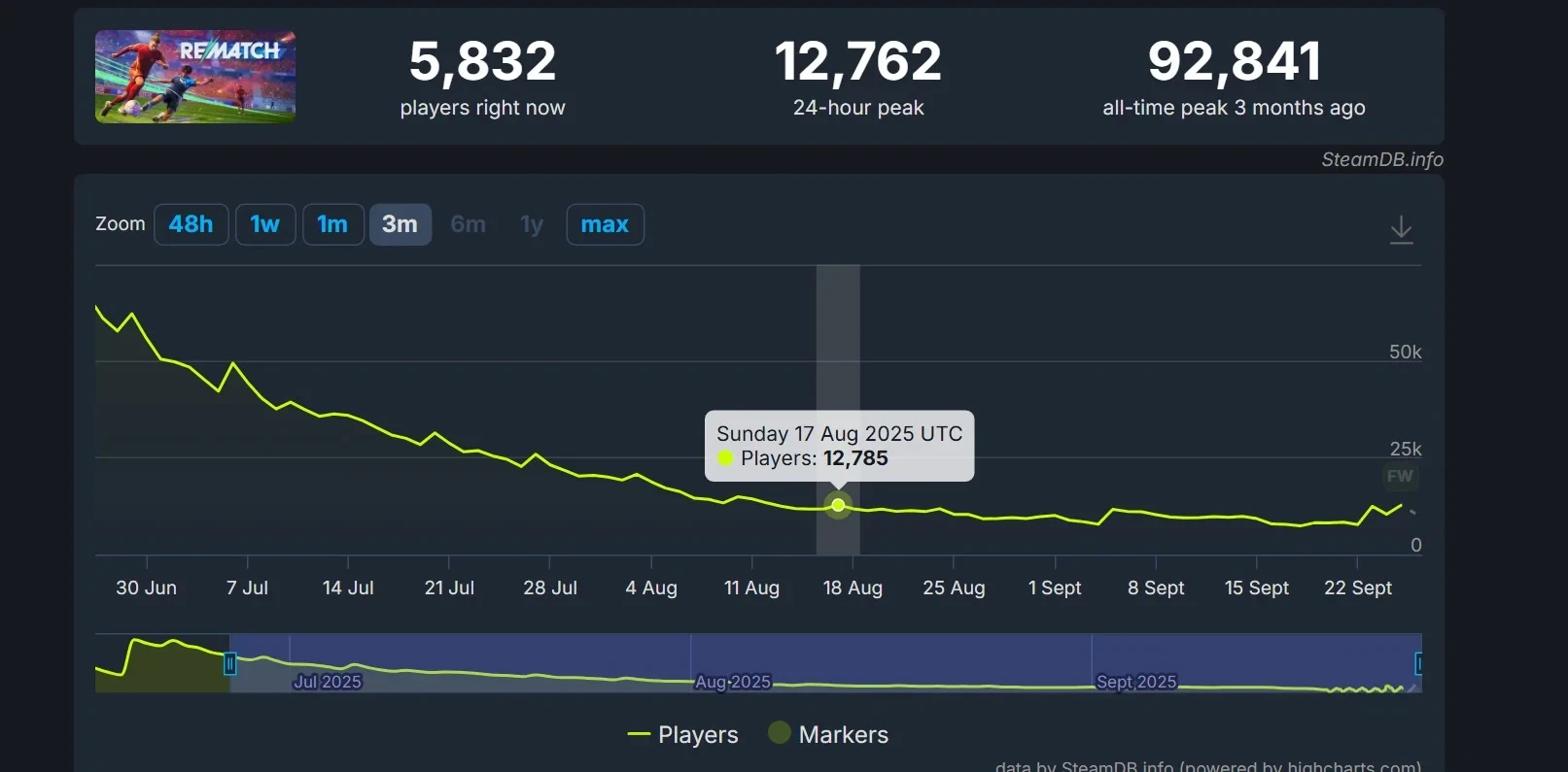 Судя по всему, бесплатные выходные смогли привлечь к Rematch хоть и небольшую, но новую аудиторию. Пиковый онлайн игры в Steam превысил 12,7 тысячи человек — в последний раз подобные значения наблюдались в начале-середине августа. Наверняка ещё больше геймеров захочет познакомиться с аркадным футсимом в течение выходных.