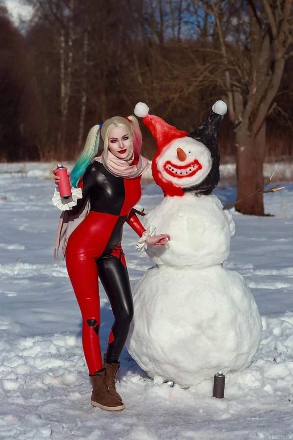 Редкое сочетание: Харли Квинн и зима. В Готэме снег редкое явление, тем более полноценные сугробы. У Виктории Кот вышел креативных образ.
