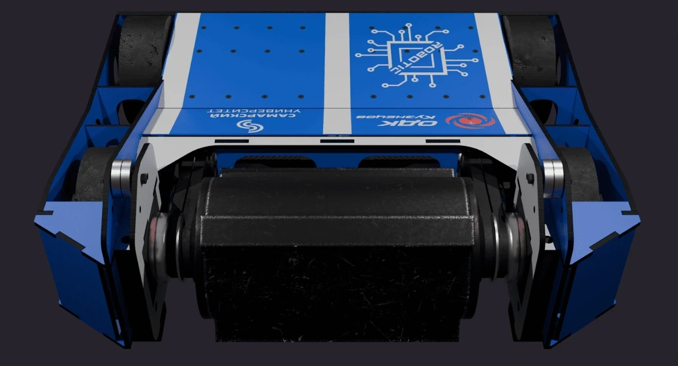 Робот построен на компактной платформе, рассчитанной на аккуратное и контролируемое движение. Ходовому блоку уделено особое внимание: машина способна точно менять направление и сохранять равновесие даже при быстрых перестроениях. Центральный вращающийся элемент отвечает за активную часть работы — он включается в нужный момент и оказывает воздействие на соперника.