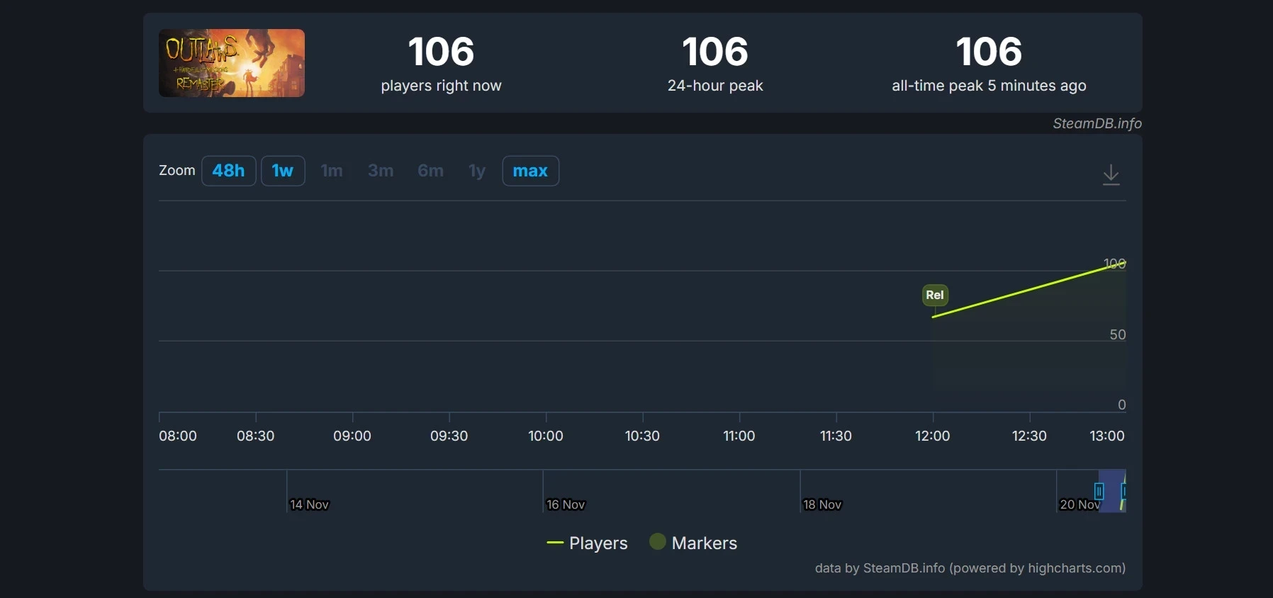 У Outlaws + Handful of Missions: Remaster ещё не сформирован рейтинг в Steam, а игроки не успели поделиться своими впечатлениями. Что касается пикового онлайна, то в момент написания новости он составил 106 человек и, вероятно, продолжит расти в ближайшие часы.