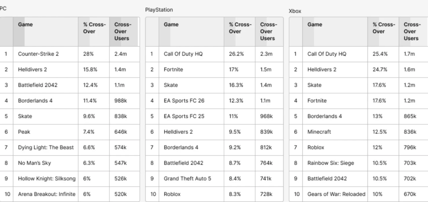 А вот в случае с ARC Raiders лишь чуть более 11% и 12% игроков на PlayStation и Xbox соответственно играли в серию Call of Duty за месяц до релиза extraction-шутера. Причём его аудитория более склонна к жанровому разнообразию, чем фанаты Battlefield 6.