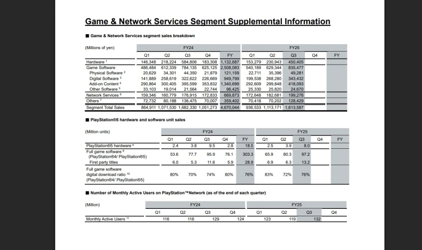По состоянию на 30 сентября 2025 года количество ежемесячных активных пользователей PlayStation Network составило 132 млн человек. Годом ранее — 129 млн человек.