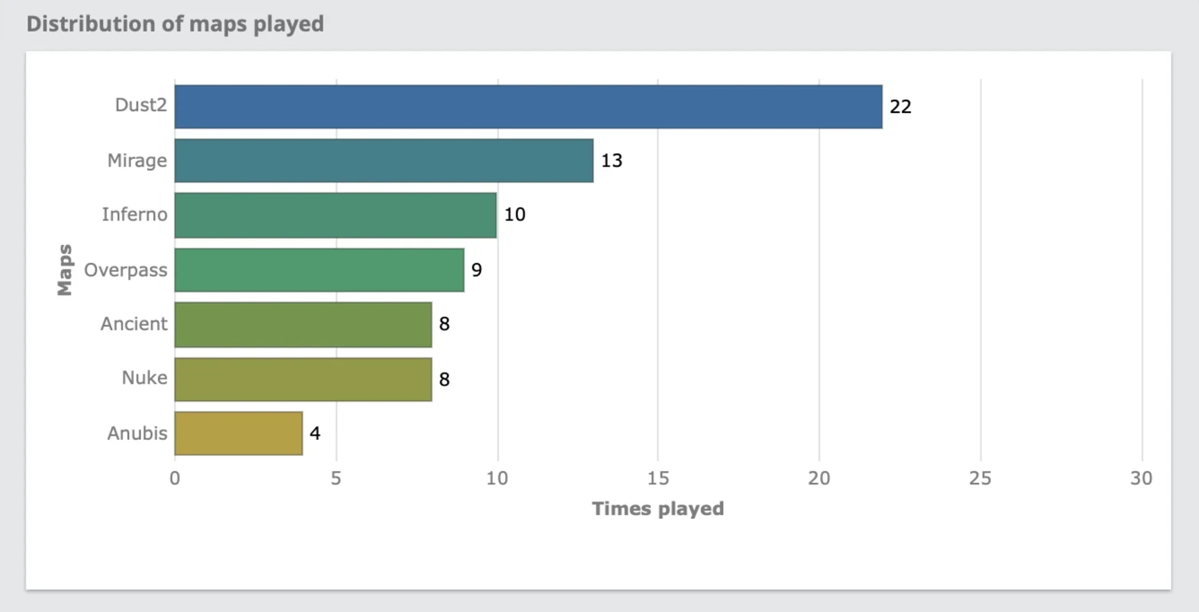 • Середина таблицы: Overpass (9 игр), а также Ancient и Nuke, которые разделили пятую строчку с 8 матчами каждая.