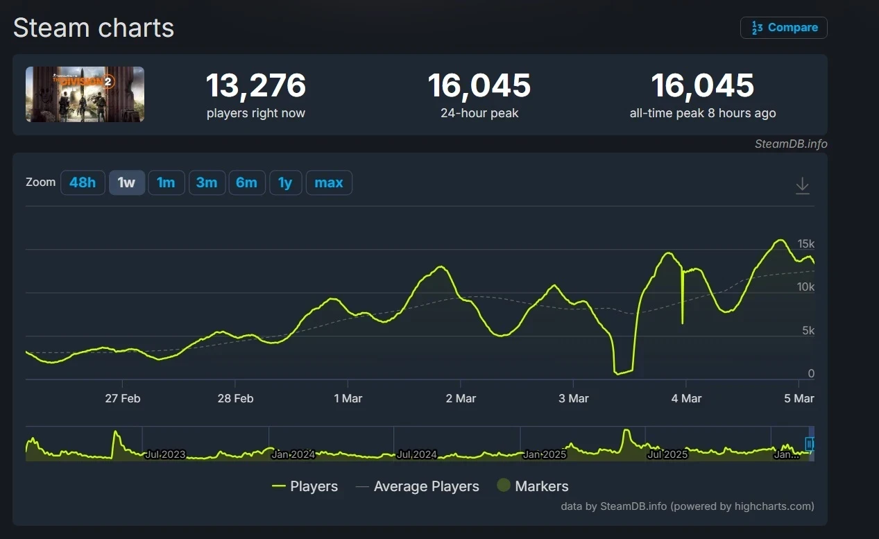 С июля 2025 года и по февраль 2026 года пик онлайна The Division 2 не достигал и 10 тысяч.