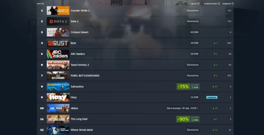 Куда интереснее следующие три игры, ворвавшиеся в топ-10 благодаря крупным скидкам и обновлению. Это Resident Evil 4 (2023) (+87 мест), Gray Zone Warfare (+15) и Where Winds Meet (+32). А замыкают десятку Warframe, Marvel Rivals и ARC Raiders.